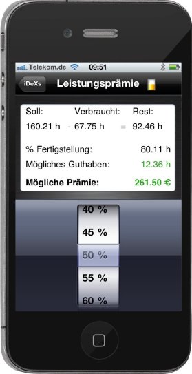 Um den Mitarbeitern eine klare Darstellung des Soll-Ist-Vergleichs zu geben, hat iDeXs eine Art Tankinhaltsanzeiger entwickelt. Nur wer weiß, wie viel Zeit aktuell noch zur Verfügung steht, wird sein Handeln so ausrichten, dass das Ziel sicher erreicht wird. In iDeXspro sieht der Mitarbeiter die Gesamtzeit, die bereits verbrauchte Zeit, die noch zur Verfügung stehende Zeit und die bereits gebuchten zusätzlichen Leistungen.